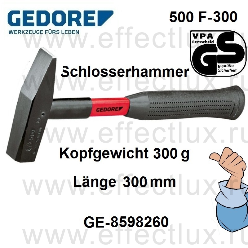 GEDORE 500 F-300 МОЛОТОК СЛЕСАРНЫЙ 300 гр. *** 500 F-300 Schlosserhammer mit Fiberglasstiel, 300 g