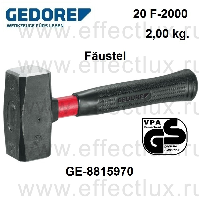 Кувалда серии 20 F весом 2000 грамм с рукояткой из стекловолокна (файберглас) и пластиковым держателем. Головка кувалды отвечает требованиям соответствующего стандарта DIN 6475. После ковки она тщательно закаливается и отпускается. Это гарантирует долгий срок эксплуатации. Боек и ударная часть кувалды обладают твердостью в границах 32.50 HRC (твёрдость по шкале С Роквелла). Твердость достигает минимум 30 мм от поверхности. Постоянный контроль качества гарантирует соответствие высокого качества продукции этим показателям. Компания Гедоре постоянно указывает необходимую информацию на головке молотка (DIN 6475, вес и логотип). Крайняя часть бойка, называемая фаской, не допускает опасных сколов, т.к. точный угол в 45° на бойке и ударной носовой части выполнен по всему периметру. На головке кувалды в обязательном порядке имеется клеймо изготовителя. Рукоятка изготовленная из стекловолона очень прочная: практически не ломается. Нечувствительна к любым погодным условиям - может также полностью использоваться при минусовых температурах и не ломаться. Устойчива к воздействию всех обычных химических веществ, таких как масла и жиры.