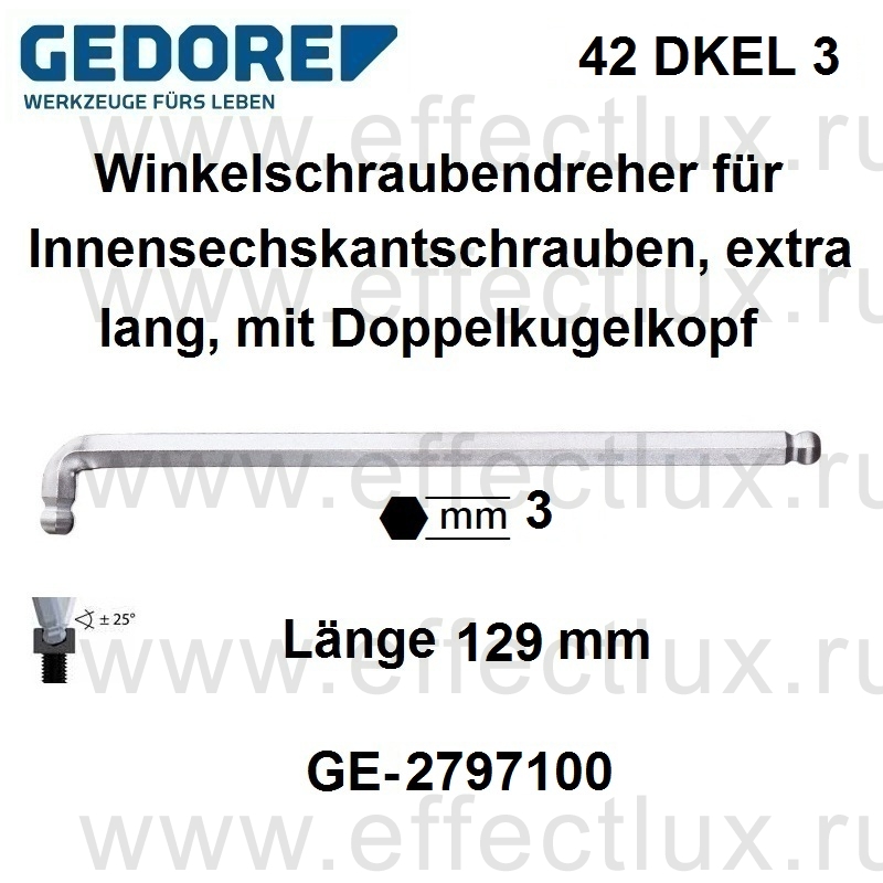 GEDORE 42 DKEL 3 КЛЮЧ ШЕСТИГРАННЫЙ ДЛЯ ВИНТОВ С ВНУТРЕННИМ ШЕСТИГРАННИКОМ, УДЛИНЁННЫЙ *** 42 DKEL 3 Winkelschraubendreher XL, Doppelkugelkopf 3 mm