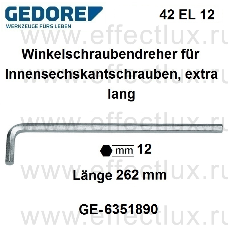 GEDORE 42 EL 12 КЛЮЧ ШЕСТИГРАННЫЙ ДЛЯ ВИНТОВ С ВНУТРЕННИМ ШЕСТИГРАННИКОМ, УДЛИНЁННЫЙ *** 42 EL 12 Winkelschraubendreher lang, Innen-6-kant 12 mm
