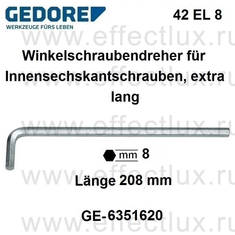 GEDORE 42 EL 8 КЛЮЧ ШЕСТИГРАННЫЙ ДЛЯ ВИНТОВ С ВНУТРЕННИМ ШЕСТИГРАННИКОМ, УДЛИНЁННЫЙ *** 42 EL 8 Winkelschraubendreher lang, Innen-6-kant 8 mm