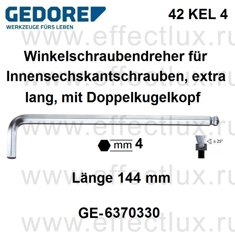 GEDORE 42 KEL 4 КЛЮЧ ШЕСТИГРАННЫЙ ДЛЯ ВИНТОВ С ВНУТРЕННИМ ШЕСТИГРАННИКОМ, УДЛИНЁННЫЙ GE-6370330