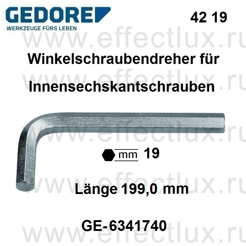 GEDORE 42 19 КЛЮЧ ШЕСТИГРАННЫЙ ДЛЯ ВИНТОВ С ВНУТРЕННИМ ШЕСТИГРАННИКОМ, 19.0 мм GE-6341740