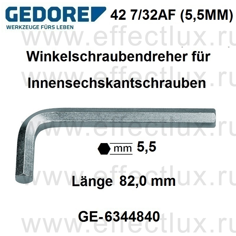 GEDORE 42 7/32AF (5,5MM) КЛЮЧ ШЕСТИГРАННЫЙ ДЛЯ ВИНТОВ С ВНУТРЕННИМ ШЕСТИГРАННИКОМ, 5,5 мм *** 42 7/32AF (5,5MM) Winkelschraubendreher, Innen-6-kant 5,5 mm