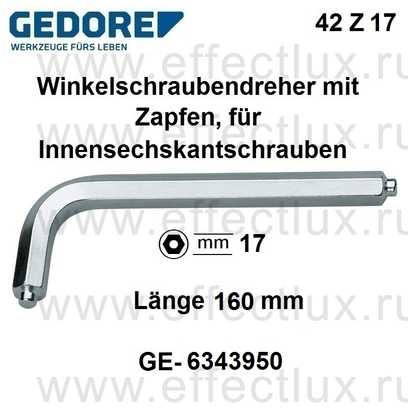 GEDORE 42 Z 17 КЛЮЧ ШЕСТИГРАННЫЙ С ВЫСТУПОМ ДЛЯ ВИНТОВ С ВНУТРЕННИМ ШЕСТИГРАННИКОМ, 17 мм *** 42 Z 17 Winkelschraubendreher mit Zapfen, Innen-6-kt 17 mm