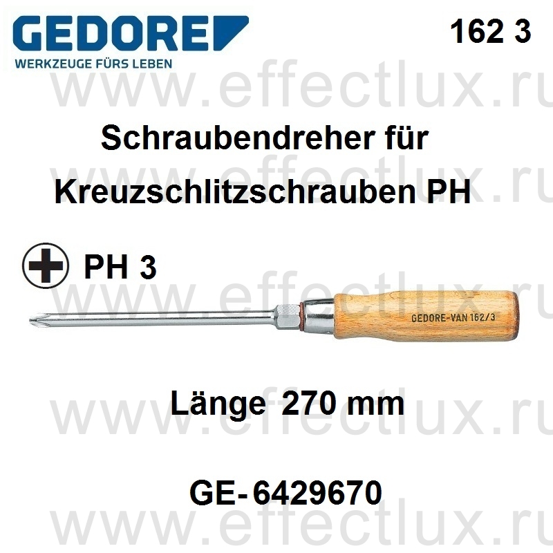 GEDORE 162 3 ОТВЕРТКИ С ДЕРЕВЯННОЙ РУКОЯТКОЙ для винтов PH с крестообразным шлицем *** 162 3 Schraubendreher mit Holzgriff, Kreuzschlitz PH 3