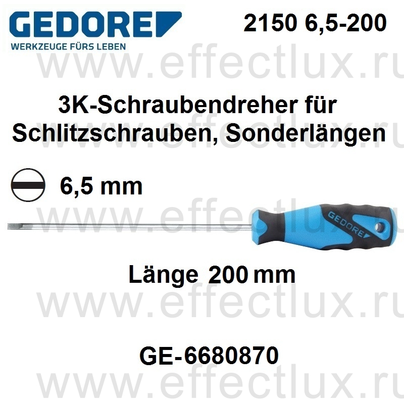 Каталог > GEDORE Профессиональный слесарно-монтажный инструмент > GEDORE Инструменты отвёрточной группы > GEDORE ОТВЕРТКИ С ТРЕХКОМПОНЕНТНОЙ РУКОЯТКОЙ > GEDORE 2150 ОТВЕРТКИ С ТРЕХКОМПОНЕНТНОЙ РУКОЯТКОЙ, для винтов с прямым шлицем нестандартной длины > GEDORE 2150 6,5-200 ОТВЕРТКА С ТРЕХКОМПОНЕНТНОЙ РУКОЯТКОЙ, для винтов с прямым шлицем GE-6680870