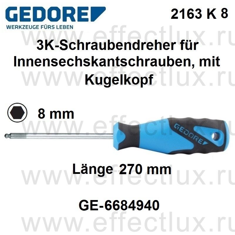 GEDORE 2163 K 8 ОТВЕРТКА С ТРЕХКОМПОНЕНТНОЙ РУКОЯТКОЙ для винтов с внутренним шестигранником *** 2163 K 8 3K-Schraubendreher, Kugelkopf, Innen-6-kant 8 mm