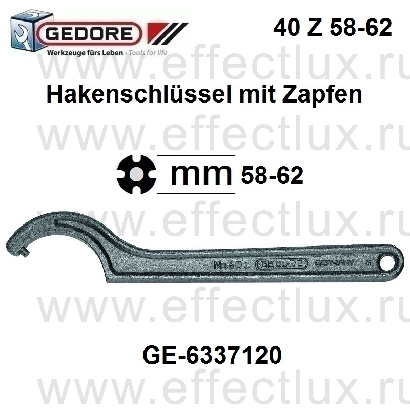 GEDORE 40 Z 58-62 КЛЮЧИ РАДИУСНЫЕ ДЛЯ КРУГЛЫХ ГАЕК со штифтом *** 40 Z Hakenschlüssel mit Zapfen, DIN 1810 Form B, 58-62 mm
