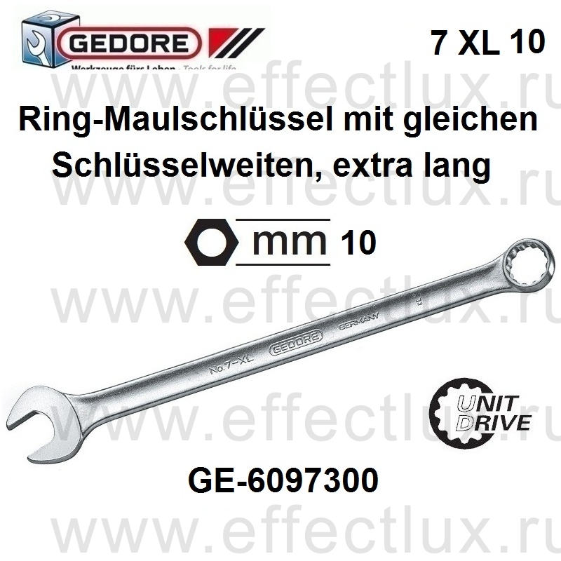 GEDORE 7 XL 10 (MM) КЛЮЧ ГАЕЧНЫЙ КОМБИНИРОВАННЫЙ удлинённый метрический 10 мм *** 7 XL Ring-Maulschlüssel mit gleichen Schlüsselweiten, extra lang UD-Profil 10 mm