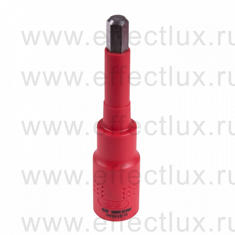 Каталог > KING TONY® Профессиональный слесарно-монтажный инструмент > Электро-изолированный инструмент VDE > Головки торцевые шестигранные и аксессуары VDE > Торцевые головки VDE с отвёрточной вставкой hex 1/2" > 4035VE10 Торцевая головка с отвёрточной вставкой диэлектрическая 1/2", HEX, 10 мм., L = 120 мм.