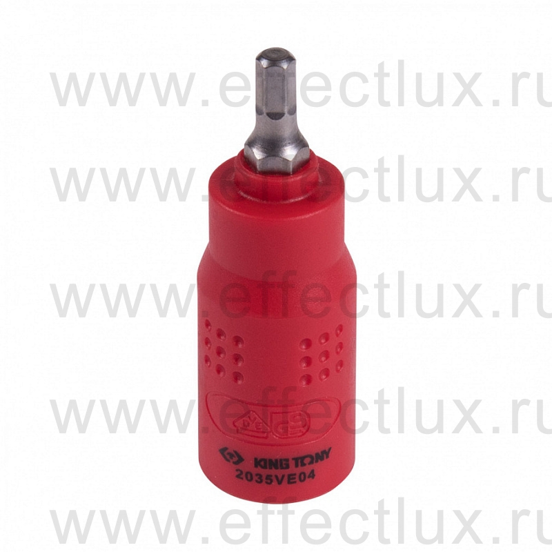 Каталог > KING TONY® Профессиональный слесарно-монтажный инструмент > Электро-изолированный инструмент VDE > Головки торцевые шестигранные и аксессуары VDE > Торцевые головки VDE с отвёрточной вставкой hex 1/4" > 2035VE04 Торцевая головка с отвёрточной вставкой диэлектрическая 1/4", HEX, 4 мм., L = 54 мм.