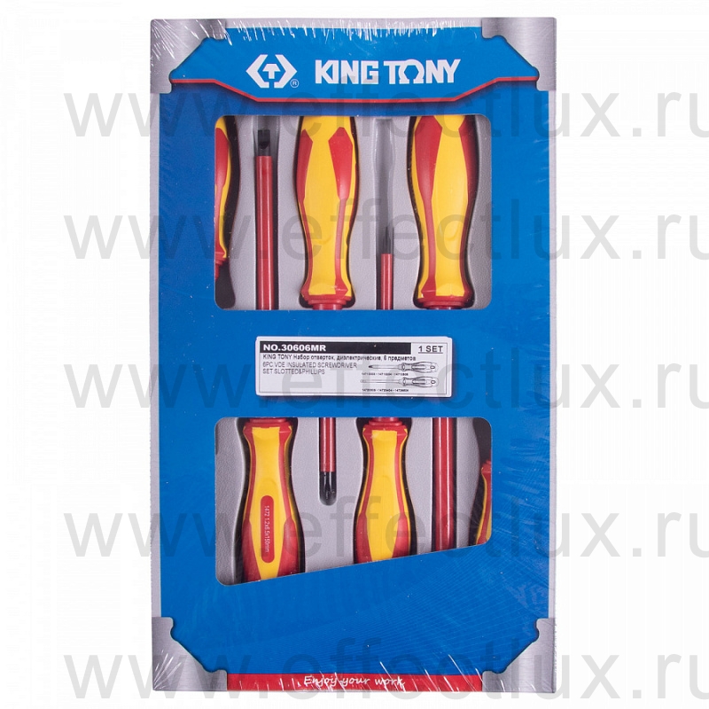 Каталог > KING TONY® Профессиональный слесарно-монтажный инструмент > Электро-изолированный инструмент VDE > Наборы VDE инструментов > 30606MR Набор отверток, диэлектрических SL+PH, 6 предметов