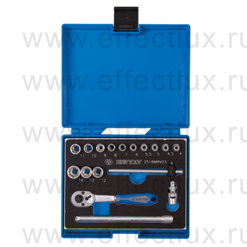Каталог > KING TONY® Профессиональный слесарно-монтажный инструмент > Торцевые головки и принадлежности > Торцевые головки и принадлежности с приводом 1/4" > Наборы торцевых головок с приводом 1/4" > 2516MRV03 Набор торцевых головок с принадлежностями 1/4", шестигранные, 4-14 мм., 17 предметов