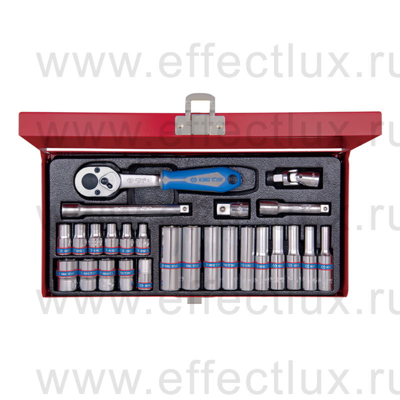 Набор с инструментом торговой марки KING TONY включает в себя торцевые головки и принадлежности, предназначен для монтажа и демонтажа крепёжных узлов различных изделий, устройств и агрегатов.