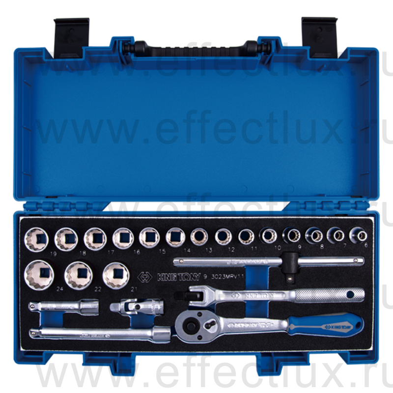 Каталог > KING TONY® Профессиональный слесарно-монтажный инструмент > Торцевые головки и принадлежности > Торцевые головки и принадлежности с приводом 3/8" > Наборы торцевых головок с приводом 3/8" > 3023MRV11 Набор торцевых головок с принадлежностями 3/8", двенадцатигранные, 6-24 мм., 23 предмета