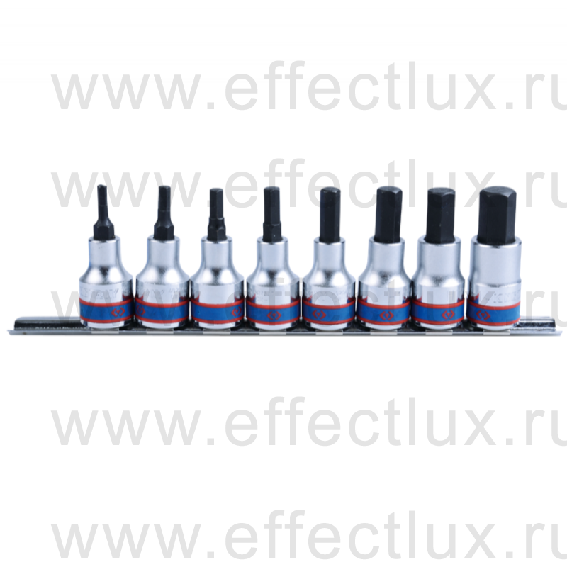 KING TONY® Набор торцевых головок 3/8" с отвёрточными вставками на планке, Hex, 3-12 мм, L = 50 мм, 8 предметов