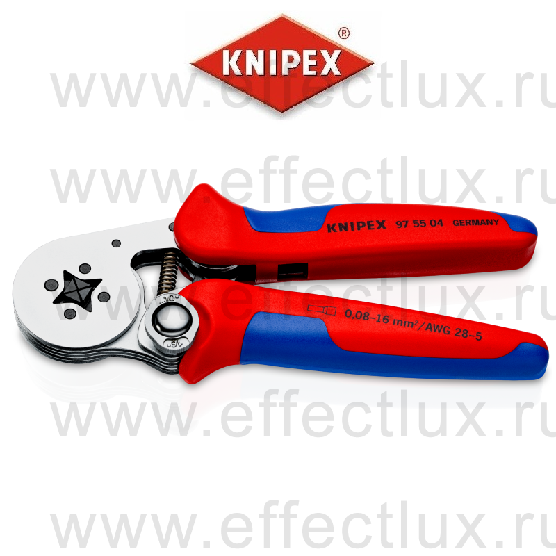 Каталог > KNIPEX® Ассортимент инструментов для профессионалов > KNIPEX Клещи для опрессовки > KNIPEX Пресс-клещи для опрессовки контактных гильз и штекеров > KNIPEX Пресс-клещи для контактных гильз DIN 46228 1+4, обжим: квадрат, боковые, 1 гнездо, 0.08-10 + 16 мм², 2 х 6 мм², длина 180 мм., хромированные KN-975504