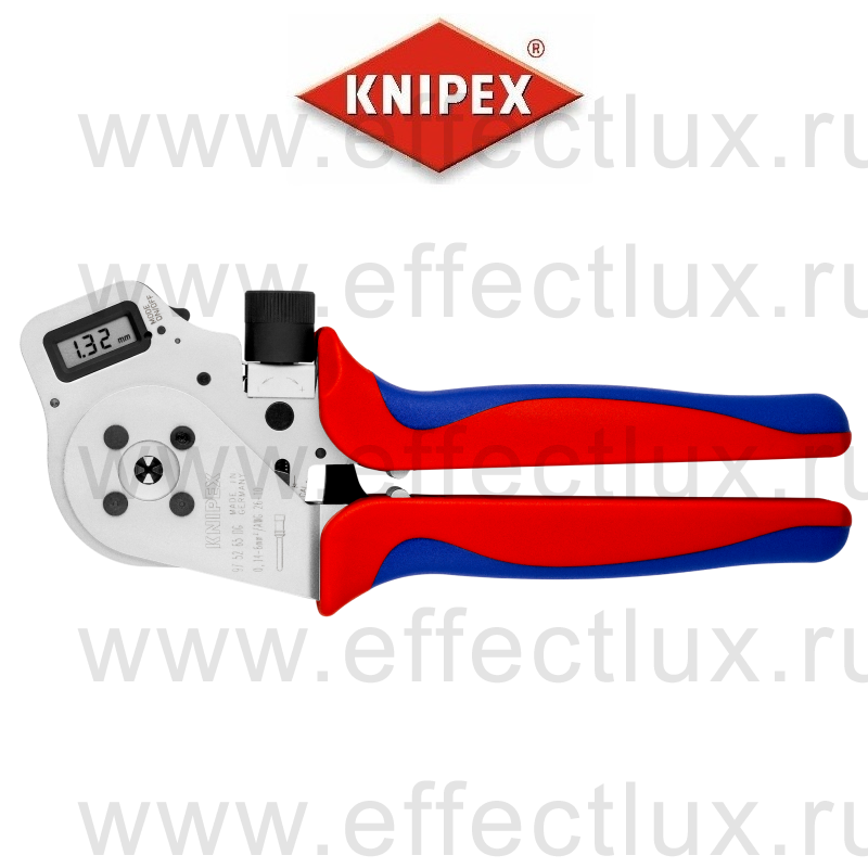 KNIPEX Пресс-клещи для тетрагональной опрессовки точеных контактов, с локатором, в кейсе, 0.14-6.0 мм², max Ø 7.5 мм., длина 230 мм., хромированные, цифровая индикация