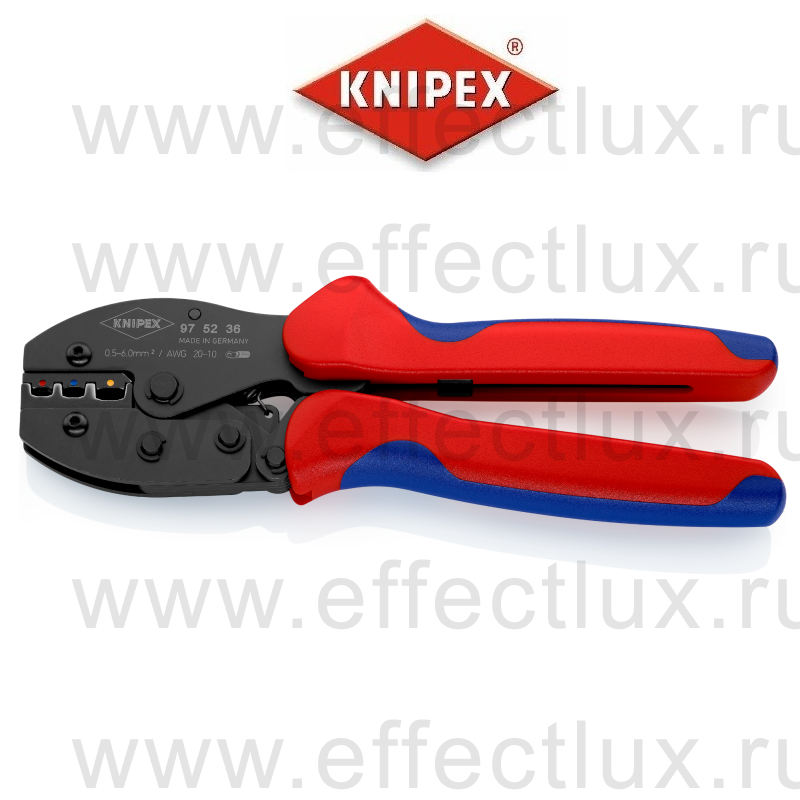 KNIPEX PreciForce® Пресс-клещи, 3 гнезда, изолированные гильзы, штекеры, 0.5-6.0 мм², длина 220 мм. KN-975236