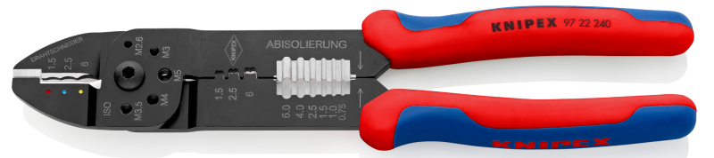 KN-9722240 - Пресс-клещи, 3 гнезда, изол. кабельные наконечники и соединители 0.5-6.0 мм², неизол. открытые штекеры 6.3 мм.: 0.5-2.5 мм², 240 мм. |