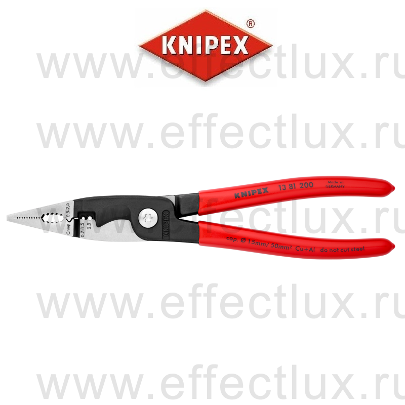 Каталог > KNIPEX® Ассортимент инструментов для профессионалов > KNIPEX Инструменты для удаления изоляции > KNIPEX Многофункциональные электромонтажные клещи > KNIPEX Клещи электромонтажные, 6-в-1, зачистка 0.75 – 1.5 / 2.5 мм², рез Ø 15 мм. / 50 мм², 200 мм, фосфатированные, обливные ручки KN-1381200