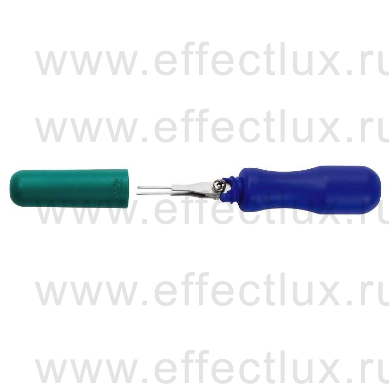 Безопасная, быстрая и простая расфиксация и демонтаж плоских штекеров из корпусов. Используется для большого количества различных корпусов, в том числе для глубоких контактных каналов. Произведено из высокопрочной пружинной стали. Защита наконечника с помощью резьбовой крышки.