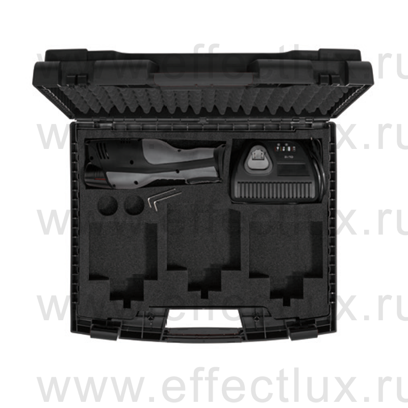 - Комплектация: Основной прибор в кейсе с аккумулятором 12 В / 2,0 А·ч и зарядным устройством (без обжимного блока).