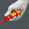 Отвёртка Wera VDE с многокомпонентной ручкой Kraftform Plus для работы в быстром и щадящем режиме: твердые зоны ручки для высокой скорости работы, в то время как мягкие зоны ручки обеспечивают передачу больших моментов силы. Поштучная проверка под напряжением 10000 В для безопасной работы на оборудовании с максимально допустимым напряжением 1000 В. Идентификатор инструментов "Take it easy" с цветовой кодировкой профиля и маркировкой размера - для простого и быстрого отбора нужного инструмента. Шестигранный край ручки предотвращает надоедливое перекатывание отвёртки на рабочем месте. Наконечник Lasertip отверток Wera обработан лазером до получения микроскопической шероховатости. Такая поверхность буквально "вгрызается" в головку винта. О непроизвольном выскальзывании отвёртки можно забыть.