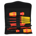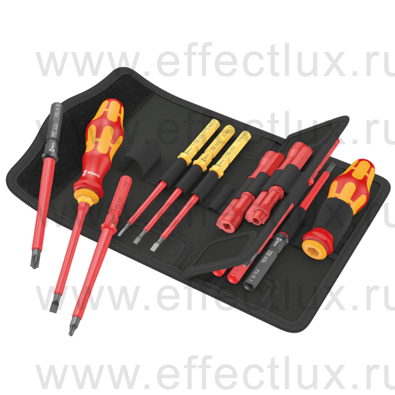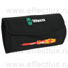 2 ручки-держатели 817 VDE Kraftform,12 сменных отвёрток VDE с идентификатором инструментов Take it easy: цветовая кодировка профиля и лазерная гравировка размера для простого и быстрого отбора нужного инструмента, 4 ключа для распределительных шкафов, 1 однополюсный тестер фазного напряжения. Инструменты проверены поштучно по стандарту IEC 60900. Поштучная проверка под напряжением 10000 В для безопасной работы на оборудовании с допустимым напряжением 1000 В. В добротной поясной сумке. Мягкая сумка имеет с обратной стороны зону на липучках. Используя прилагаемые полоски-липучки, такую сумку можно крепить к компонентам системы Wera 2go. А можно к стене, полке и инструментальной тележке.