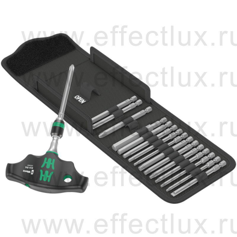 Набор из 17 предметов в добротном мягком футляре. 1 бито-держатель с поперечной ручкой 416 RA с трещоткой и быстро-зажимным патроном Rapidaptor под биты ¼". Встроенная трещотка с тонким механизмом зацепления (80 зубцов/угол возврата 4,5°) упрощает и ускоряет завинчивание без утомительного перекидывания. Трещоточный механизм, полностью скрытый в ручке, обеспечивает лёгкую и комфортную работу. Переключатель реверса позволяет просто изменить направление вращения одной рукой. Эргономичная форма ручки повторяет изгибы ладони, пальцы плотно ложатся в округлые выемки. Вся рука получает контакт с ручкой, таким образом не теряется сцепление между ладонью и ручкой. Бито-держатель для битов с шестигранным хвостовиком 1/4" по стандарту DIN ISO 1173-C 6,3 и E 6,3. С технологией Rapidaptor для моментальной смены битов. 16 закалённых до вязкой твёрдости битов, ¼", длиной 89 мм, для универсального применения.