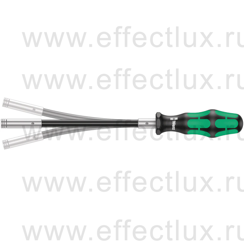 Отвёртка с гибким стержнем для работы в труднодоступных местах. Благодаря конструкции с особо тонким бито-держателем можно завинчивать винты самого разного профиля даже в очень ограниченном пространстве. Многокомпонентная ручка Kraftform для высокой скорости работы и особенно эргономичного завинчивания. С шестигранным краем для защиты от перекатывания. Исходная идея при создании ручки Kraftform заключалась в том, что форма ручки должна определяться формами руки. Время подтвердило верность данного решения. Уже в шестидесятые годы компания Wera совместно с всемирно известным институтом Фраунгофера разработала ручку отвертки, прекрасно подходящую по форме к человеческой руке. В 1968 г. после длительной работы компания Wera представила ручку Kraftform на рынке. По настоящее время ручка оптимизировалась с помощью новых технологий, но сохранила свою проверенную форму,ведь человеческая рука за это время тоже не изменилась.