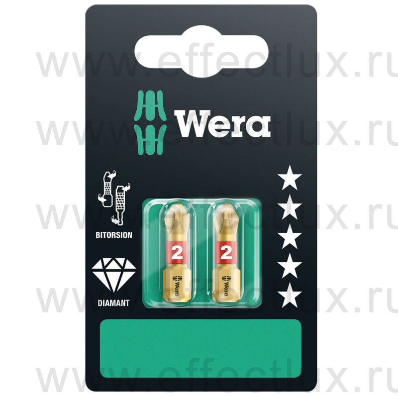 WERA 851/1 BDC SB SiS PH2-2 Биты торсионные для винтов Phillips в SB упаковке, алмазное напыление, 1/4" C6.3, 2 х PH 2 x 25 мм. WE-073335