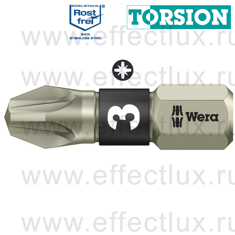 WERA 3855/1 TS PZ3 Бита торсионная для винтов Pozidriv, из нержавеющей стали, 1/4" C6.3, PZ 3 x 25 мм. WE-071022