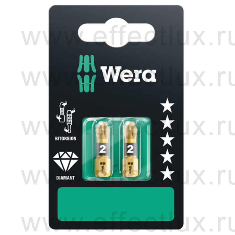 WERA 855/1 BDC SB SiS PZ2-2 Биты торсионные для винтов Pozidriv в SB упаковке, алмазное напыление, 1/4" C6.3, 2 х PZ 2 x 25 мм. WE-073339