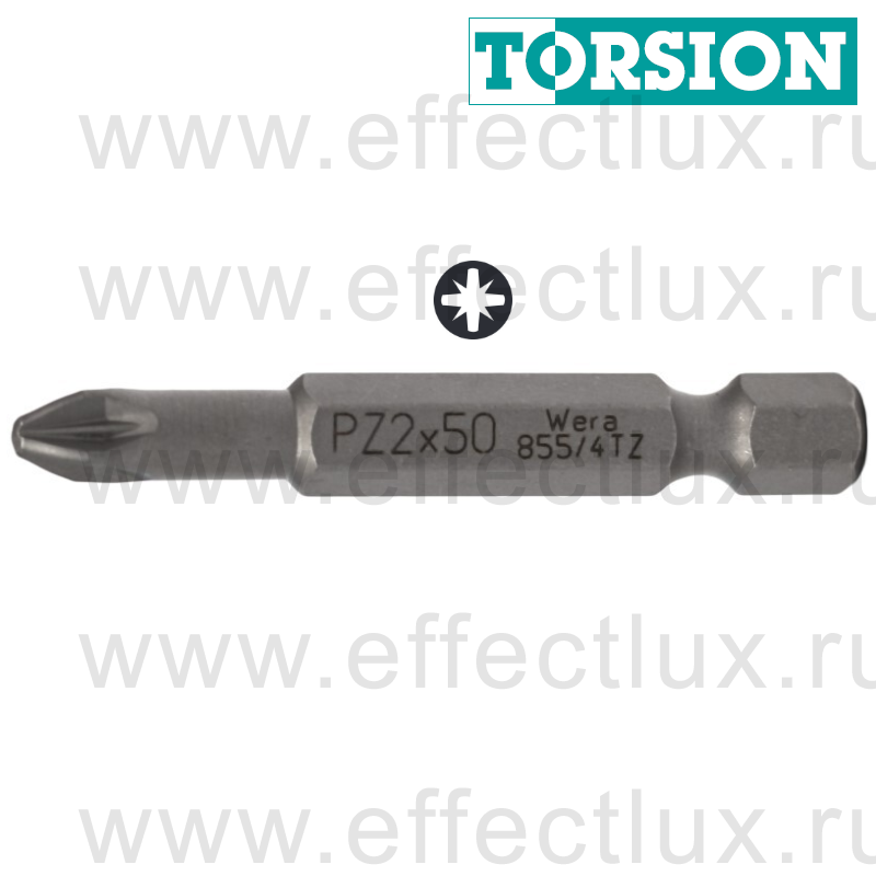 WERA 855/4 TZ PZ2 Бита торсионная для винтов Pozidriv, вязко-твёрдая, 1/4" E6.3, PZ 2 x 50 мм. WE-060010