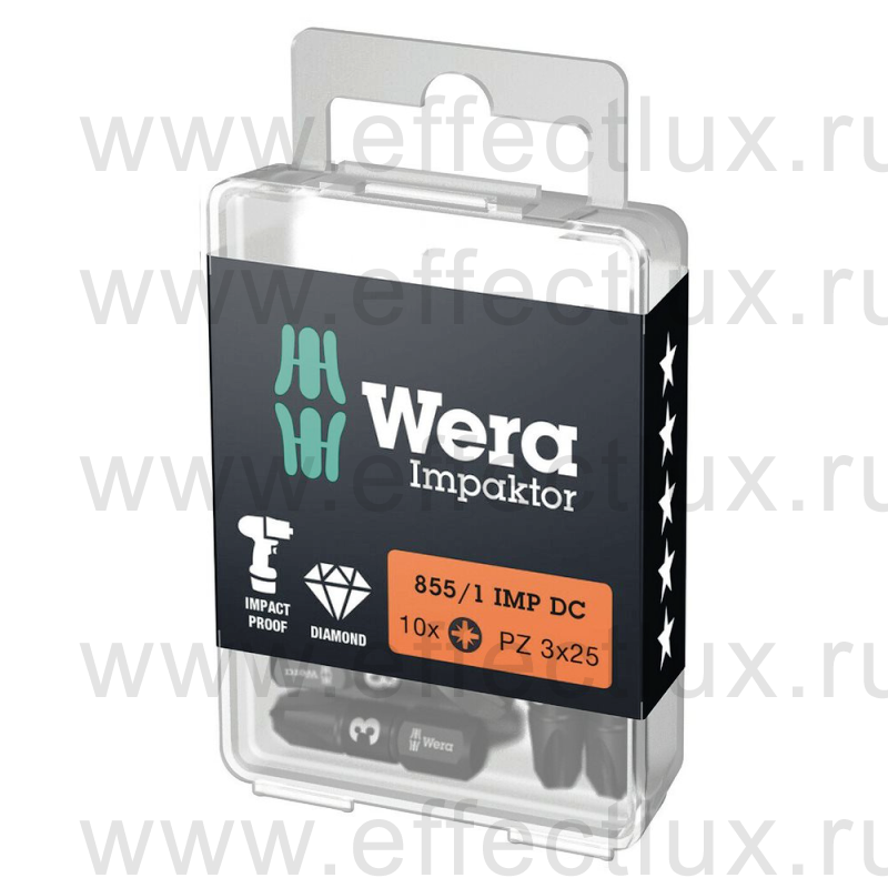 WERA 855/1 IMP DC PZ3 DIY Impaktor Набор бит ударных с алмазным напылением наконечников, 1/4" C6.3, 10xPZ3x25 мм. WE-057622