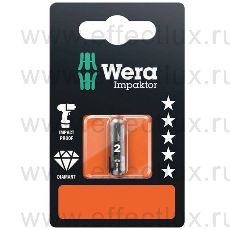 WERA 855/1 IMP DC SB PZ2 Impaktor Бита ударная с алмазным напылением наконечника в SB упаковке, 1/4" C6.3, 1xPZ2x25 мм. WE-073921