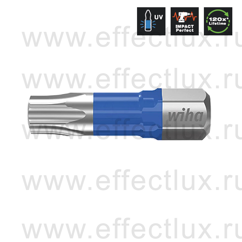 Пластиковая оболочка на торсионной зоне светится в UV-лучах, что облегчает поиск биты. Увеличенный до 120 раз срок службы (по сравнению со стандартными битами Wiha).