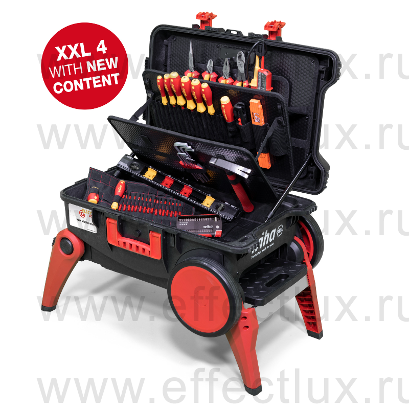 Электрикам нужны разные инструменты в разных местах. Многие ящики для инструментов не обеспечивают достаточной устойчивости, и часто только с большими усилиями все необходимые инструменты можно аккуратно разместить. Совсем наоборот, футляр для инструментов XXL 4 electric от Wiha впечатляет широким ассортиментом инструментов, достаточным пространством для хранения и абсолютной прочностью. Благодаря очень большим колесам чемодан легко тащить за собой по пересеченной местности или по лестнице. Откидные ножки также обеспечивают нескользящий удар по корпусу. Кроме того, благодаря приподнятому положению возможно удобное, щадящее спину извлечение инструментов. V-образная выемка со шкалой в крышке багажника облегчает распиловку, например, кабельного канала на строительной площадке. Обширное оснащение XXL 4 electric означает, что подходящий инструмент всегда под рукой для любого применения. Эргономичные отвертки, инновационные плоскогубцы, портативная отвертка и набор долот slimVario® для быстрого обслуживания, а также многие другие инструменты заметно облегчают повседневную работу. При этом полностью изолированные инструменты защищают пользователя при работе с токо-ведущими деталями. В то же время эргономичная конструкция ручного инструмента Wiha заметно экономит мышцы и сухожилия, особенно при работе в условиях постоянного использования. Корпус изготовлен из прочного полипропиленового пластика и дополнительно оснащен газовыми пружинами, которые удерживают крышку в различных положениях и предотвращают защемление пальцев в результате случайного падения крышки.