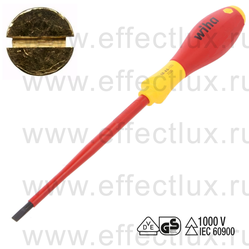 Эргономичная много-компонентная рукоятка VDE Wiha SoftFinish® с защитой от скатывания. Профиль наконечника отмечен на торце рукояти.