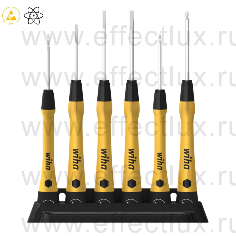 Каталог > WIHA Профессиональный ручной инструмент > Инструменты отвёрточной группы > WIHA Отвёртки для точных работ PicoFinish® ESD > WIHA Наборы микро-отвёрток для точных работ PicoFinish® ESD > WIHA 270P Набор микро-отвёрток PicoFinish® ESD профиль: Schlitz, Phillips, 6 предметов+держатель WI-43707
